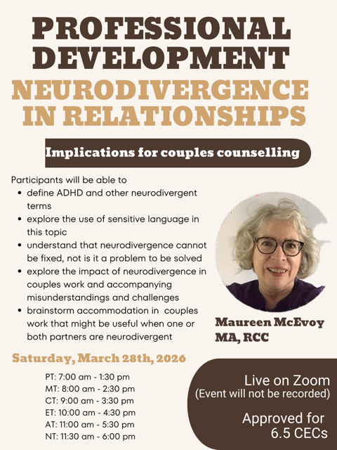 Time: PT: 8:30 am - 3:00 pm | MT: 9:30 am - 4:00 pm | CT: 10:30 am - 5:00 pm | ET: 11:30 am - 6:00 pm | AT: 12:30 - 7:00 pm | NT: 1:00 - 7:30 pmRegistration Link: https://members.ccpa-accp.ca/public/event/details/324719545c14f30acc1d58f26e30c42573ad1dbd/1